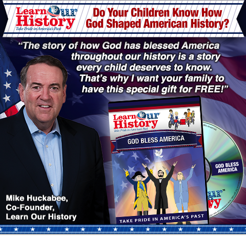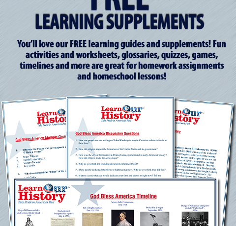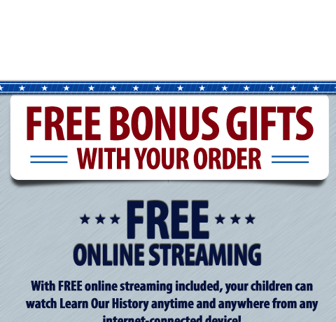 Bless your children with this truly exceptional educational gift—Order Learn Our History’s God Bless America on DVD today. It’s absolutely FREE when you try Learn Our History! You just pay $1 s&h. Plus, you’ll get FREE bonus learning guides and FREE online streaming, too! What's more, you’ll also have the opportunity to receive a new DVD from this great series around once a month, charged at a special low price, along with additional FREE learning guides and FREE online streaming! See terms below. But please hurry—This special offer is available while supplies last, so go ahead and order your FREE DVD now!